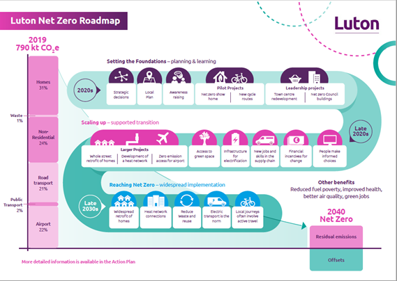 Luton Borough Council now has an improved understanding of the scale and types of actions required within the borough to work towards their net zero target. The council also has an improved awareness of where it can use its influence to reduce emissions in the borough as well as indicative timeframes to progress the actions identified. The Net Zero Roadmap and draft climate change policy and action plan are currently out for public consultation.